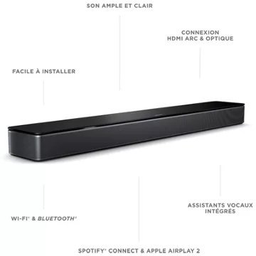 La marque BOSE saura vous séduire avec sa nouvelle barre de son Smart Soundbar 300. Légèrement plus compacte que les précédentes, vous plongerez dans un son intense, des dialogues précis et des basses riches, le tout avec un assistant vocal intégré pour une utilisation simplifiée.
