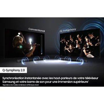 • Q symphony : oui, synchroniser les hauts parleurs de votre télévision compatible avec ceux de votre barre de son et vivez une expérience plus immersive