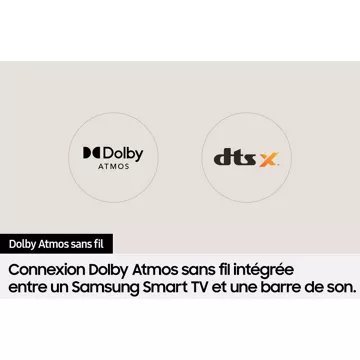 (1) Le Dolby Atmos sans fil via Wi-Fi est compatible avec les téléviseurs Samsung QLED Q80B, la gamme Neo QLED 2022, la gamme OLED 2022 et les téléviseurs The Frame 2022 (LS03B, hors le 32 »). Contenu source Dolby Atmos et DTS:X requis.