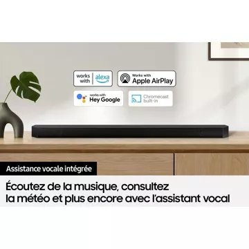 Agréable à écouter, simple à utiliser. Avec la fonction Tap Sound, vous n’aurez plus de mal à vous connecter à votre barre de son. Posez votre smartphone sur votre Samsung HW-Q700B, attendez quelques secondes et le tour est joué ! Parcourez vos playlists préférées et faites résonner vos chansons préférées dans toute la maison, le tout en qualité Dolby Atmos. Pour vous proposer toujours plus de solutions, cette barre de son Q-Series Samsung intègre aussi Chromecast et Airplay 2 (4), afin de partager votre musique sans faire de compromis sur le confort.