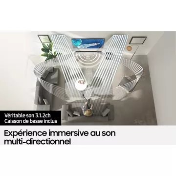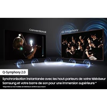 Avec la barre de son Samsung HW-S800B, découvrez un son à la fois puissant et immersif. Grâce à ses 10 haut-parleurs et son caisson de basse 6,5″ inclus, cette barre de son 3.1.2ch crée un environnement audio complet pour une expérience totale et captivante. Disponible pour la première fois sans fil, le format Dolby Atmos (1) vient renforcer cette immersion en vous offrant un son 3D surround unique sans qu’aucun câble ne vienne gêner votre visionnage ! En complément, la technologie DTS Virtual:X recrée le son de vos contenus en optimisant le rendu sonore (renforcement des basses, clarté des dialogues et effets surround). Les amateurs de films apprécieront son haut-parleur central qui clarifie les dialogues et l’innovation Q-Symphony 2.0 qui synchronise les haut-parleurs de votre TV Samsung avec ceux de la barre de son pour décupler sa puissance et rendre votre expérience cinématographique encore plus immersive et captivante. Vous voulez encore plus d’immersion ? Créez-vous une solution home cinéma complète avec les enceintes arrières sans fil SWA-9500S (2) !
