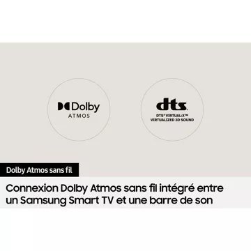 (1) Dolby Atmos sans fil via Wi-Fi est compatible avec une sélection de TV Samsung 2022. * Dolby Atmos et DTS:X disponible sur les barres de son Q-SERIES 2022. * Contenu source Dolby Atmos et DTS:X requis. (2) En option