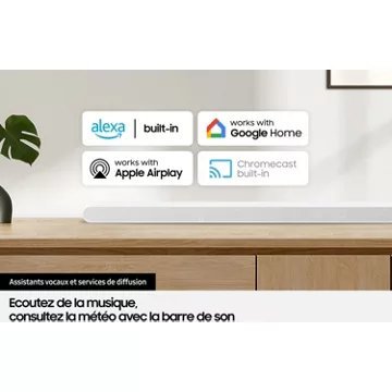 La HW-S811D/XE excelle dans l’intégration avec votre téléviseur, notamment grâce à Q-Symphony 3.0 qui synchronise les haut-parleurs de la barre de son avec ceux de votre TV Samsung pour une expérience sonore à 360°. La connectivité sans fil est à l’honneur avec la possibilité de partager vos contenus via Bluetooth et Wi-Fi, et la prise en charge de Chromecast et Airplay 2 pour une diffusion aisée de votre musique. La fonctionnalité HDMI eARC assure un son 3D à haut débit, et la télécommande unique simplifie le contrôle de vos appareils. Enfin, la barre de son est compatible avec les enceintes arrière SWA-9500S pour une expérience cinématographique complète, et la commande vocale via Alexa intégré apporte une facilité d’utilisation supplémentaire.