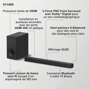 La HT-S400 est une Barre de son 2.1 avec caisson de basse séparé de Sony spécialement conçue pour vous immerger dans vos films, jeux vidéo et musiques préférés. Elle offre une expérience sonore enveloppante, avec un son cinématographique, riche et puissant grâce à sa technologie S-Force PRO Front Surrond et ses haut-parleurs brevetés X balanced