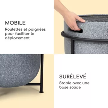 L’imposant braséro est fabriquée en MGO (Magnesium Fiberclay) robuste et léger, ainsi que dans une coque en acier de haute qualité. Sa forme ronde moderne attire tous les regards et s’intègre parfaitement dans n’importe quelle ambiance de jardin. En posant la grille de cuisson en acier chromé, passez d’un feu flamboyant au plaisir gustatif en grillant des saucisses, steaks, brochettes de légumes ou même du fromage grillé. La livraison comprend également un pare-étincelles pratique qui protège tous ceux qui se trouvent à proximité du feu des étincelles incontrôlées. Grâce à deux poignées latérales, le braséro Grail avec barbecue de blumfeldt peut être transporté et déplacé à tout moment.