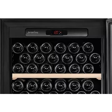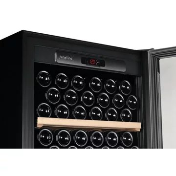 - Type de porte : vitrée, permet de visualiser facilement les bouteilles sans avoir à ouvrir la porte, ce qui réduit la circulation de l’air dans la cave et donc la variation de la température. Le traitement anti-uv protège le contenu.