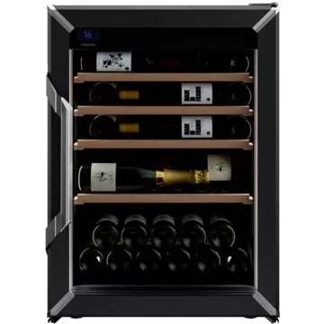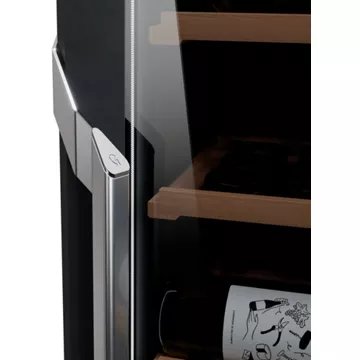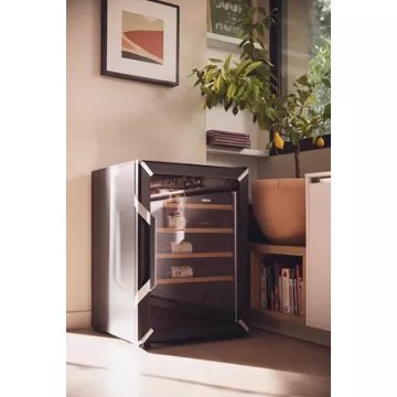 - Type de porte : vitrée, permet de visualiser facilement les bouteilles sans avoir à ouvrir la porte, ce qui réduit la circulation de l’air dans la cave et donc la variation de la température. Le traitement anti-uv protège le contenu.