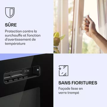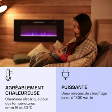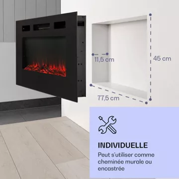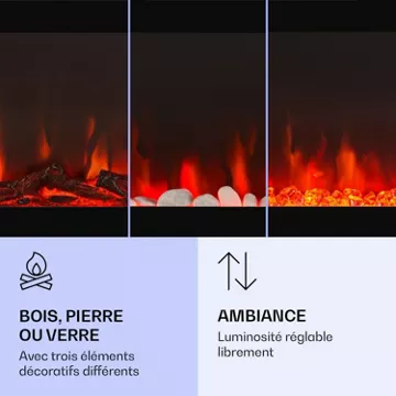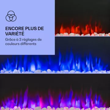 Décoration murale fonctionnelle d’un genre différent : avec la cheminée électrique Klarstein Galeras, enrichissez votre intérieur d’une cheminée murale à la fois magnifique et produisant de la chaleur. En appuyant sur un bouton de la télécommande pratique, faites briller le jeu de flammes de la Galeras en différentes couleurs et intensités. Le thermostat intégré réglable entre 16 et 30 °C garantit une température de bien-être adéquate. Grâce au programmateur hebdomadaire, définissez vos propres horaires de chauffage et laissez-vous accueillir par une chaleur agréable et des couleurs inspirantes. Grâce à son design sobre, le foyer mural et encastrable Galeras s’intègre idéalement dans tout type d’intérieur.