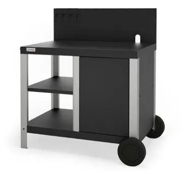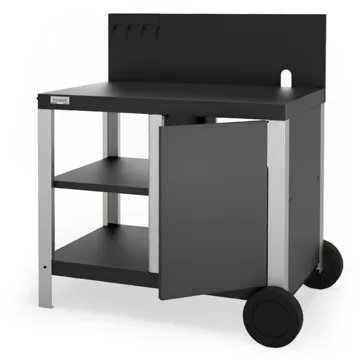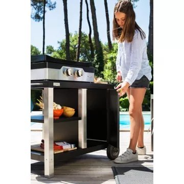 « . 1 plateau supérieur 87*54 cm. 1 Crédence haute 87*27 cm avec porte-ustensiles. 2 étagères 43*36 cm. 1 porte avec système d’ouverture  » push-pull  » (une simple pression déclenche l’ouverture de la porte) pour dissimuler la bouteille de gaz. 2 roues avec enjoliveurs. 1 poignée. En version ino satiné. Dimensions : L99 P64 H102 . A monter soi-même. Certification Origine France Garantie. Garantie : 5 ans »Déplacement facile sur tout type de terrain : 2 roues avec enjoliveurs et 1 poignéeLarge espace de travail : plateau supérieur 87×54 cm pouvant recevoir la plancha Allure 260 avec son couvercleEspace de rangement fonctionnel : 2 étagères, 1 espace de rangement fermé pour la bouteille de gaz et un porte-ustensiles inclus