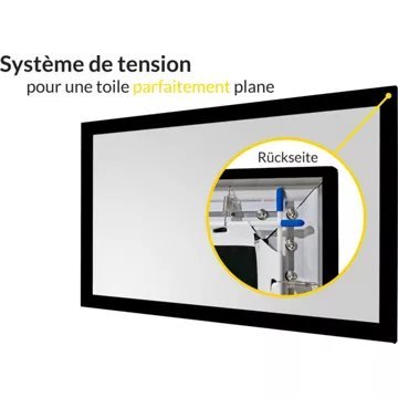 L’écran sur cadre a été pensé pour être monté facilement. Tout le matériel nécessaire est inclus dans la livraison. Le cadre est fixé avec des joints. La toile est tendue à l’arrière grâce à des ressorts, elle vous garantit ainsi un tendu optimal.