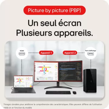 - Format : 21/9, offre 1/3 d’espace supplémentaire à l’écran, et permet d’afficher plusieurs fenêtres