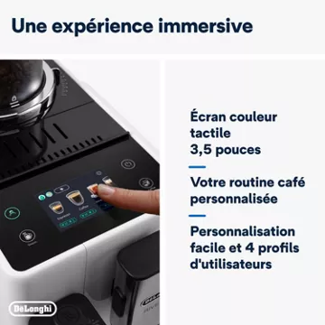 INTERACTION IMMERSIVE : Profitez d’une interaction fluide grâce à l’écran couleur tactile 3,5 pouces intuitif. La machine propose 16 boissons préprogrammées d’une simple touche et apprend vos habitudes de café, personnalisant ainsi votre menu tout au long de la journée, et pouvant sauvegarder jusqu’à 4 profils d’utilisateurs. Plongez-vous dans une expérience café des plus captivantes.