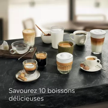 L’hygiène est primordiale pour maintenir la qualité des boissons et la durabilité de la machine. Le système autoMilk Clean assure un nettoyage vapeur automatique du système de lait après chaque utilisation, garantissant une hygiène irréprochable. L’accès en façade au percolateur facilite l’entretien et le nettoyage, rendant les opérations de maintenance rapides et efficaces. Avec un poids net de 8.5 kg et une puissance de 1500 W, cette machine robuste est conçue pour offrir des performances constantes. Les accessoires inclus, tels que le filtre à eau BRITA INTENZA et le système d’émulsion du lait, complètent l’expérience en assurant une qualité de café inégalée et une utilisation confortable au quotidien.