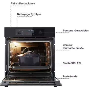 • Avantage pyrolyse : La température intérieure du four monte jusqu’à 500°C et détruit les graisses, vous n’avez plus qu’à récupérer les cendres à l’aide d’un torchon et le tour est joué !