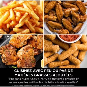 • Volume de la cuve : 9,5 L – Capacité de frites fraîches : 2,8 kg – Cuisson : avec une cuillère d’huile ou sans huile