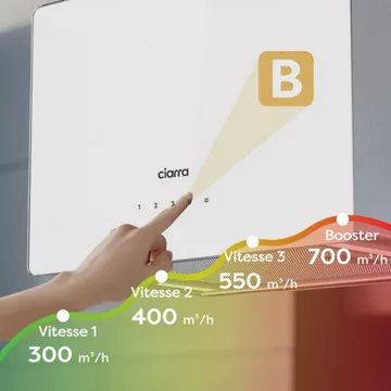 Le mode Booster permet d’augmenter le taux d’extraction de 700 m³/h, ce qui élimine rapidement et efficacement les odeurs et les fumées. Fonctionne silencieusement avec un faible niveau sonore de 44 à 64 dB pendant l’utilisation.