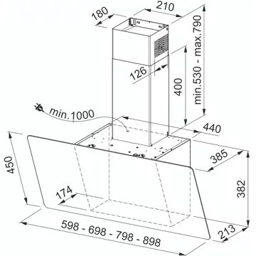 - Type de hotte : décorative murale inclinée, combine style et fonctionnalité. Sa conception permet de mieux gérer l’espace au-dessus de la zone de cuisson. Elle évite de devenir un obstacle dans l’espace de cuisson et n’obstrue pas la vue, rendant plus facile la préparation des plats.