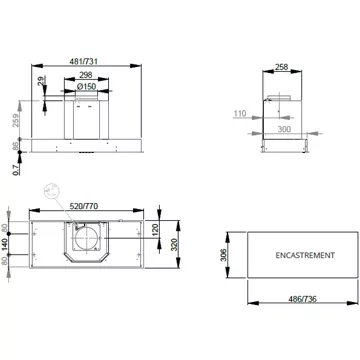 - Type de hotte : encastrable, s’intègre parfaitement dans les armoires, préservant l’esthétique de la cuisine. Elle offre une extraction efficace des fumées et odeurs tout en restant discrète. Son design discret et sa performance font d’elle un choix idéal pour les cuisines modernes soucieuses de leur apparence.