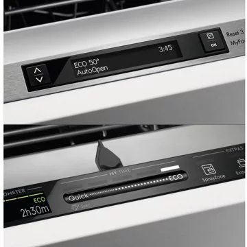 Conçu pour s’insérer discrètement dans la cuisine, le lave-vaisselle EEG48300L est d’un design simple et élégant. Le bandeau de commande situé sur la tranche supérieure de la porte d’ouverture cache la technologie QuickSelect. Vous avez peu de temps pour faire tourner le lave-vaisselle ? Indiquez le nombre de minutes dont vous disposez. Il s’occupe automatiquement du reste !