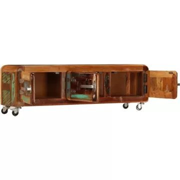 Le meuble Hi-Fi est fabriqué en bois de récupération massif provenant de solives, de planchers et de poutres de soutènement d’anciens bâtiments en cours de démolition, et il peut être composé de différents types de bois comme le Sesham (bois de rose), le pin, le teck, le hêtre, le chêne, le cèdre, le manguier, l’acacia, etc.