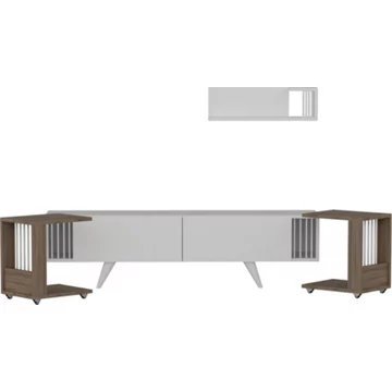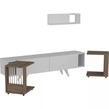Cet ensemble de meubles de salon design embellira votre intérieur. Il se compose d’un banc TV, de 2 tables d’appoint à roues et d’une étagère murale. Les petites tables offrent 2 surfaces de stockage et se rangent aux côtés du banc, ainsi elles vous permettent d’économiser de la place.< p>
