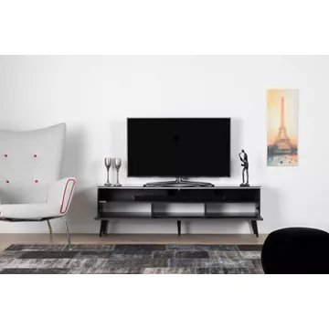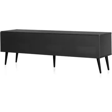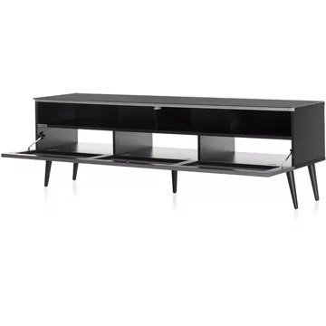 Meuble TV avec porte en textile acoustique & infrarougeALMERIA 160 offre des solutions de gestion des câbles et d’aération pour vos équipements audio-vidéo.Caisson en bois mélaminé de couleur noire.2 configurations intérieures disponibles (le choix se fait lors du montage du meuble) : version standard avec 6 compartiments et version spéciale barre de son avec 4 à 5 compartiments.Porte abattante en textile acoustique infrarouge de couleur grise pour télécommander vos périphériques sans ouvrir la porte. Ouverture par pression avec aimant poussoir.Le plateau en verre trempé de couleur noire offre une finition brillante tout en apportant une protection supplémentaire. Pieds scandinaves de couleur noire.Meubles livrés non montés avec notice et visserie.Garantie 2 ans.