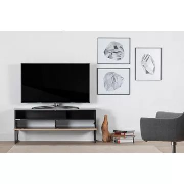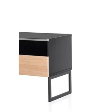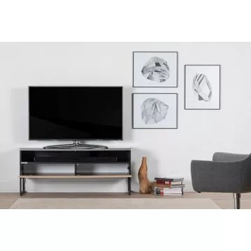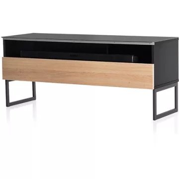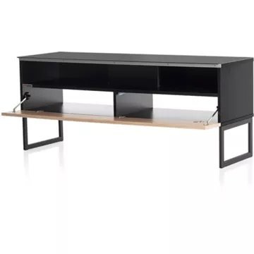 Meuble TV avec demi-porte abattanteMURCIE 120 offre des solutions de gestion des câbles et d’aération pour vos équipements audio-vidéo.Caisson en bois mélaminé de couleur noire.2 configurations intérieures disponibles (le choix se fait lors du montage du meuble) : version standard avec 4 compartiments et version spéciale barre de son avec 3 compartimentsDemi-porte abattante en bois clair permettant de laisser la partie supérieure du caisson ouverte pour pouvoir utiliser sa barre de son et piloter ses appareils sans ouvrir le meuble. Ouverture par pression avec aimant poussoir.Le plateau en verre trempé de couleur noire offre une finition brillante tout en apportant une protection supplémentaire. Pieds design de couleur noire.Meubles livrés non montés avec notice et visserie.Garantie 2 ans
