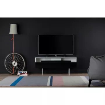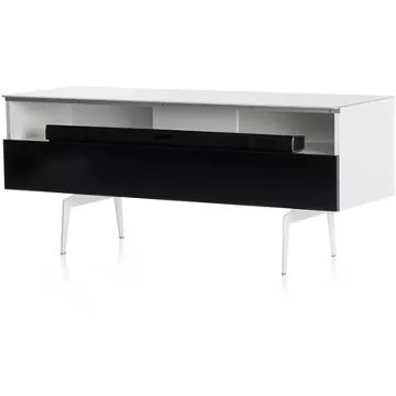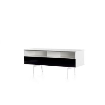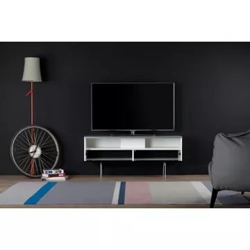 Meuble TV avec demi-porte abattanteSALAMANQUE 120 offre des solutions de gestion des câbles et d’aération pour vos équipements audio-vidéoCaisson en bois mélaminé de couleur blanche.2 configurations intérieures disponibles (le choix se fait lors du montage du meuble) : version standard avec 4 compartiments et version spéciale barre de son avec 3 compartiments.Demi-porte abattante de couleur noire permettant de laisser la partie supérieure du caisson ouverte pour pouvoir utiliser sa barre de son et piloter ses appareils sans ouvrir le meuble. Ouverture par pression avec aimant poussoir.Le plateau en verre trempé de couleur blanche offre une finition brillante tout en apportant une protection supplémentaire. Pieds vintage de couleur blanche.Meubles livrés non montés avec notice et visserie.Garantie 2 ans.