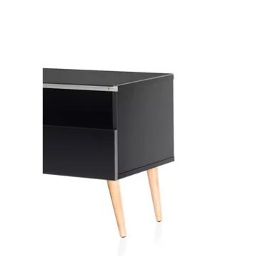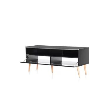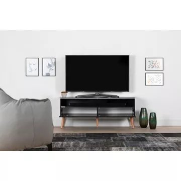 Meuble TV avec demi-porte abattanteTARRAGONE 120 offre des solutions de gestion des câbles et d’aération pour vos équipements audio-vidéoCaisson en bois mélaminé de couleur noire.2 configurations intérieures disponibles (le choix se fait lors du montage du meuble) : version standard avec 4 compartiments et version spéciale barre de son avec 3 compartiments.Demi-porte abattante noire permettant de laisser la partie supérieure du caisson ouverte pour pouvoir utiliser sa barre de son et piloter ses appareils sans ouvrir le meuble. Ouverture par pression avec aimant poussoir.Le plateau en verre trempé de couleur noire offre une finition brillante tout en apportant une protection supplémentaire. Pieds scandinaves de couleur bois clair.Meubles livrés non montés avec notice et visserie.Garantie 2 ans