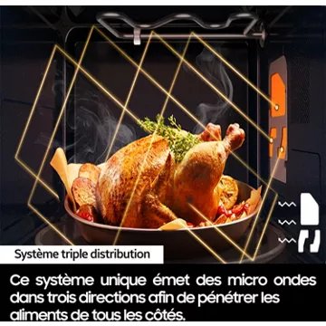 Le micro-ondes SAMSUNG MS32DG4504GT se distingue par son design moderne et sa finition inox noire, qui s’intègre parfaitement dans toute cuisine contemporaine. Doté d’une capacité généreuse de 32L et d’un plateau tournant de 31,8 cm, il est idéal pour les familles ou pour ceux qui aiment recevoir. La poignée encastrée et la porte minimaliste offrent une touche d’élégance et facilitent l’accès, que ce soit par le haut ou le bas. La facilité d’utilisation est assurée par un contrôle électronique intuitif, complété par un bouton pour un ajustement précis des paramètres, tandis que l’affichage LED blanc apporte une visibilité claire et moderne.