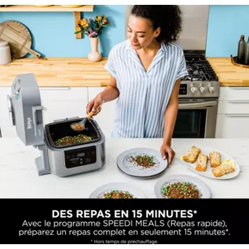 Avec le cuiseur NINJA speedi ON400EU, vous pourrez cuisiner pour toute la famille. Cet appareil combine différents modes de cuisson : vapeur, rôtisserie ou friture, le tout en simultané.