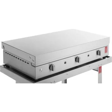 Plancha Inox304 Qualité Alimentaire Lisse Plaque Lisse 80 + Couvercle à Charnières PLANET – Plaque de cuisson 79x40cm, épaisseur 5mm, Renforts anti-torsion, Découpe possible sur la plaque, Pas de migration entre la plaque et les aliments, pas de modification du goût des aliments 3 Brûleurs à bande large – Allumage Piezzo électronique – Bac à graisse incliné intégré sur façade – Pieds réglables en hauteur – Caisson de combustion isolé de la structure pour la sécurité et la performance thermique – Couvercle fixe à Charnières, Garantie : Composants = 3 ans, Plaque 10 ans
