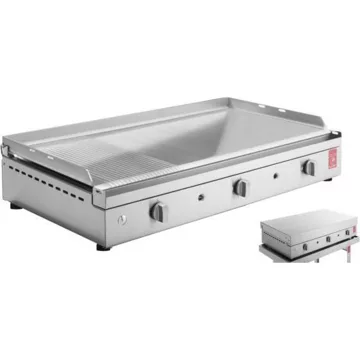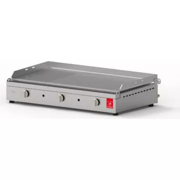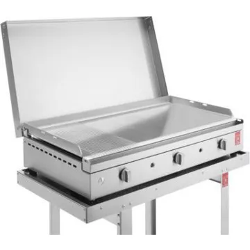 Plancha Inox304 Qualité Alimentaire Plaque 80 : 2/3 Lisse 1/3 Rainurée – Plaque de cuisson 79x40cm, épaisseur 5mm, Renforts anti-torsion, Découpe possible sur la plaque, Pas de migration entre la plaque et les aliments, pas de modification du goût des aliments 3 Brûleurs à bande large – Allumage Piezzo électronique – Bac à graisse incliné intégré sur façade – Pieds réglables en hauteur – Caisson de combustion isolé de la structure pour la sécurité et la performance thermique – Couvercle fixe à Charnières, Garantie : Composants = 3 ans, Plaque 10 ans
