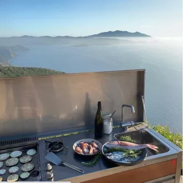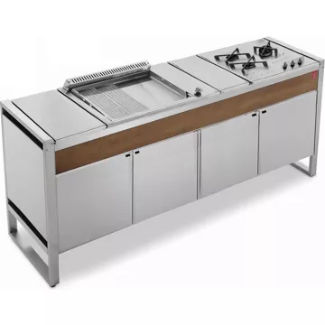 Table Cuisson fermée Inox304 Qualité Alimentaire, Porte avant maintenue par 2 verins, joues latérales amovibles, équipée d’une Plancha OASI 80 Lisse + Evier Encastrable et Mitigeur Pliable et Couvercle Inox 316 + Tablette bois + Friteuse, Plaque de cuisson 79x40cm, épaisseur 5mm, Renforts anti-torsion, Découpe possible sur la plaque, Pas de migration entre la plaque et les aliments, pas de modification du goût des aliments, Tablettes en contreplaqué marine tout Okumé FSC, capot intégral en Inox Marin 316, Les 2 tablettes latérales sont amovibles, la table peut être installée sur pieds réglages ou roulettes discrètes en teflon pour être mobile, Dimensions : 205x56x88, Puissance : 8400 Watts, Norme : CE, Nombre de convives : De 6 à 12 convives, Type de Gaz : Butane&Propane ou Méthane (buses fournies), Garantie : Composants 3 ans, Plaque 10 ans