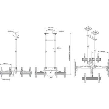 Le support de plafond 014-6014 est conçu pour monter quatre écrans ou moniteurs de 50 à 75 pouces répondant au standard VESA (100x100mm min, 600x400mm max) jusqu’à 45 kg. Ce support professionnel multi-écrans repose sur deux mâts réglables en hauteur (860 mm min – 3255 mm max) qui peuvent être installés sur un plafond plat ou incliné, et des bras télescopiques sur lesquels sont montés en carré quatre écrans pour fournir une solution d’affichage plafond multi-écrans. Très fonctionnels, les bras horizontaux sont réglables en profondeur pour une installation facile et un réglage précis des écrans. Avec une rotation à 360° et une inclinaison ajustable vers le haut et vers le bas (+6°/ -15°), ce support vous apporte le meilleur angle de vision en fonction de votre besoin. Conçu dans une optique d’esthétisme pour être installé en magasin et dans tout lieu recevant du public, ce support intègre enfin un système efficace pour la gestion des câbles qui garantit un rendu parfait.