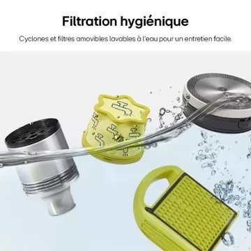Allumez et éteignez facilement votre aspirateur ou sélectionnez différents niveaux de puissance d’une seule pression du pouce. Son manche téléscopique permet d’ajuster la longueur à la hauteur désirée pour une utilisation confortable et ses filtres amovibles et lavables facilitent sa maintenance.