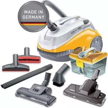 TECHNOLOGIE AQUA BOX: L’air pollué, les poils d’animaux et les saletés aspirés sont humidifiés et propulsés dans un bain d’eau qui les retient définitivement. L’air sortant a été filtré lors de sa circulation dans l’appareil et s’est chargé de particules d’eau. Il est expulsé au travers un filtre HEPA 13 renforcé d’un filtre anti-odeur à charbon actif. Ensuite il n’y a plus qu’à simplement vidé l’eau sale contenu dans la cuve. Tous les éléments ainsi aspirés sont définitivement et proprement éliminés.