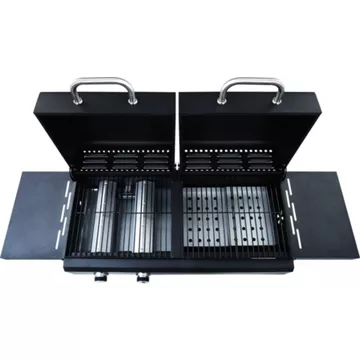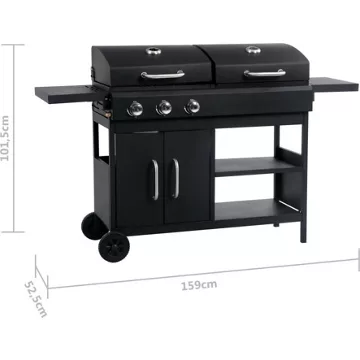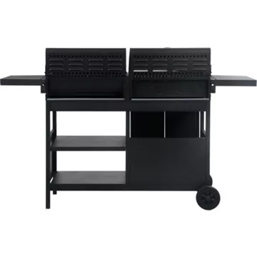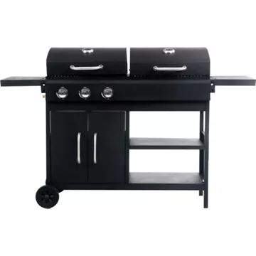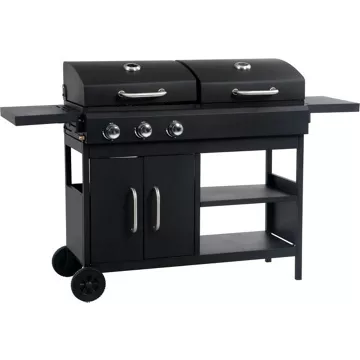 Le gril combiné comprend une zone de cuisson au charbon de bois et une zone de cuisson au gaz avec 3 brûleurs. Il dispose de 2 hottes robustes, chacune avec un thermomètre intégré qui affiche la température de cuisson. Deux tables d’appoint pliables offrent un espace supplémentaire pour faire des sauces ou vos plats d’accompagnement préférés. Fabriqué en matériaux lourds, le gril combiné est très durable.