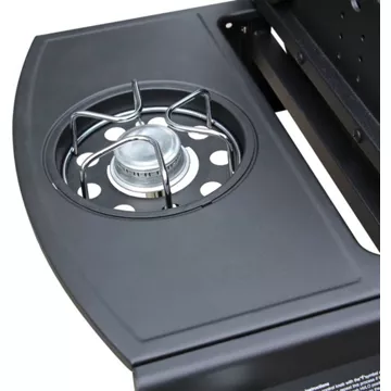 Le gril à gaz dispose d’un design élégant et fonctionnel. Il a une grande surface de cuisson et une hotte robuste avec un thermomètre intégré qui affiche avec précision la température de cuisson. Une table d’appoint offre un espace de travail supplémentaire pour faire des sauces ou vos plats favoris. Un récipient d’égouttage à graisse amovible est également inclus et est facile à nettoyer.