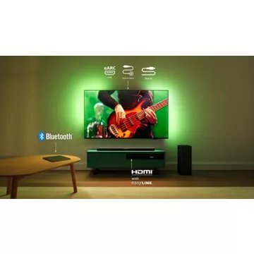 La Philips TAB6309 se distingue par sa connectivité étendue, incluant Bluetooth® 5.3 avec support LE Audio pour une diffusion musicale sans fil de haute qualité, HDMI eARC pour une synchronisation parfaite avec l’écran, ainsi que des entrées optique, auxiliaire et USB. L’application Philips Home Entertainment offre une interface intuitive pour gérer les réglages de la barre de son depuis un smartphone ou une tablette. De plus, la fonction Philips EasyLink permet de contrôler la barre de son et un téléviseur Ambilight avec une seule télécommande, simplifiant ainsi l’utilisation au quotidien. Avec son design ultra-plat, cette barre de son s’intègre harmonieusement à tout intérieur et se marie parfaitement avec les téléviseurs Ambilight pour une expérience visuelle et sonore en totale symbiose.