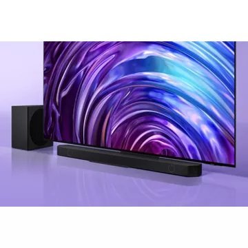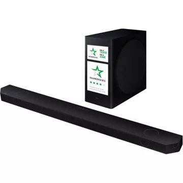 La barre de son Samsung HW-Q810D, avec ses neuf haut-parleurs incluant un haut-parleur central pour des dialogues clairs et des haut-parleurs verticaux pour les effets surround, offre une expérience sonore riche et détaillée. Cette configuration assure une immersion sonore exceptionnelle, vous plongeant au coeur de l’action.