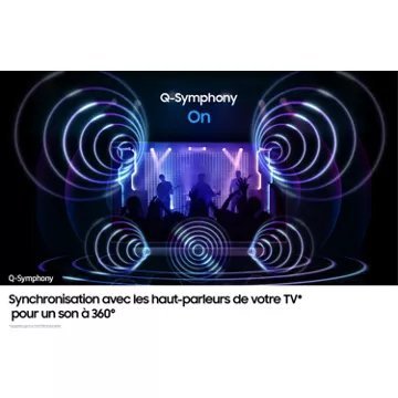 Grâce à Q-Symphony, les haut-parleurs de votre téléviseur sont synchronisés avec ceux de la barre de son Samsung. Les sons des deux appareils sont combinés pour créer une immersion sonore à 360 degrés. Avec un son immersif, vous profitez de votre contenu comme jamais auparavant.