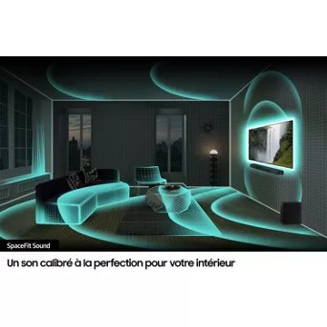 Avec la technologie SpaceFit Sound, votre barre de son Samsung analyse la taille et l’aménagement de votre pièce pour s’y adapter. Le son est calibré spécifiquement pour votre espace de vie. Cette fonctionnalité garantit un son personnalisé, offrant une qualité audio optimale en fonction de votre intérieur.