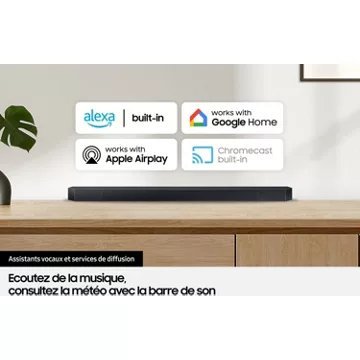 Intégrant Chromecast et Airplay 2, la barre de son Samsung facilite le partage de votre musique préférée en conservant une excellente qualité sonore. Vous pouvez envoyer de la musique sur votre barre de son directement depuis votre smartphone ou tablette.