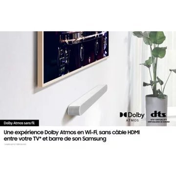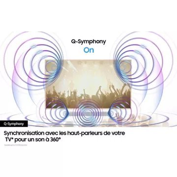 La HW-S67D excelle également dans sa capacité à se synchroniser avec votre téléviseur. Grâce à la technologie Q-Symphony 3.0, elle peut se connecter aux téléviseurs Samsung QLED, Neo QLED et The Frame récents, créant une harmonie sonore à 360°. La barre de son prend en charge les connexions HDMI eARC pour un son 3D de haute qualité, ainsi que la connexion sans fil pour un espace épuré sans câbles encombrants. Elle est également compatible avec Chromecast, Airplay 2, et Roon Tested, facilitant le partage de votre musique. De plus, avec la fonction Tap Sound, connectez votre smartphone en un geste pour partager instantanément vos playlists. La télécommande unique et les commandes vocales via Alexa intégré rendent l’utilisation de la HW-S67D à la fois simple et intuitive. La HW-S67D est non seulement un atout pour votre système audio, mais aussi un élément qui s’intègre parfaitement à l’écosystème de votre smart home.