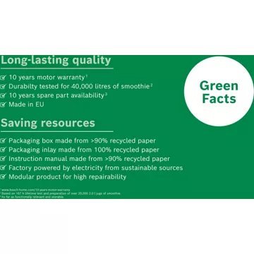 Le confort d’utilisation est au cœur de la conception du Blender BOSCH VitaPower Série 6 MMB6654B. Avec ses 6 programmes automatiques tactiles, il offre une expérience utilisateur intuitive et sécurisée, notamment grâce à un couvercle sécurisé qui empêche le démarrage si celui-ci n’est pas correctement verrouillé. Le nettoyage est tout aussi aisé, soit par le programme automatique dédié, soit au lave-vaisselle, simplifiant ainsi l’entretien au quotidien. Ce blender n’est pas seulement un allié de choix pour votre cuisine, il est également conçu pour durer. Testé pour mixer l’équivalent de 40.000 litres de smoothies, il promet une longévité exceptionnelle. Son poids net de 5,4 kg et ses dimensions compactes (47 x 21 x 21 cm) le rendent facile à manipuler et à ranger, faisant de lui un appareil aussi robuste que pratique.