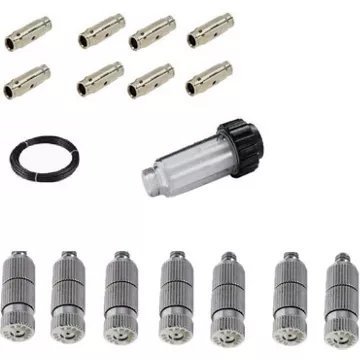 Brumisateur haute pression 50/60 bars de qualité professionnelle avec buses anti gouttes. Rafraichit sans mouiller et temporisateur intégré. Super silencieux (30dB). Livré avec 10m de tuyau et 8 buses anti gouttes et télécommande