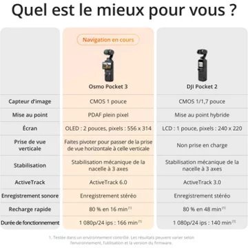 La caméra sport DJI Osmo Pocket 3 est conçue pour s’adapter à toutes les situations de tournage. Son écran tactile rotatif de 2 pouces facilite le passage entre les modes de prise de vue horizontale et verticale, offrant une flexibilité et un contrôle accrus. ActiveTrack 6.0 permet de suivre les sujets avec fluidité, rendant les séquences cinématographiques accessibles d’une seule main. La caméra est également équipée d’options d’enregistrement stéréo et est compatible avec DJI Mic 2 pour une qualité sonore cristalline. Son format compact assure que vous ne manquerez jamais un moment à capturer, tandis que les effets glamour 2.0 et les réglages de beauté personnalisés garantissent que vous serez toujours sous votre meilleur jour.