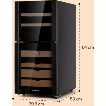 Sa capacité intérieure de 89 litres et quatre tiroirs spacieux en bois de cèdre offrent un espace de stockage pour vos cigares. Trois étagères de stockage dans la zone supérieure permettent de stocker jusqu’à 9 bouteilles de vin. Des rails faciles à manipuler permettent un accès rapide et confortable. L’hygromètre intégré permet de maintenir facilement le taux d’humidité idéal. Ainsi, les cigares ne se dessèchent pas et conservent toute leur saveur. Des températures de stockage constantes avec un réglage au degré près entre 5 et 10 °C dans la zone supérieure et 10 et 18 °C dans la zone inférieure par commande tactile empêchent en outre la perte d’arômes due à une chaleur trop importante et garantissent en même temps la température de dégustation idéale des vins stockés. Un éclairage LED à commande séparée offre une vue d’ensemble et met parfaitement en scène ce concentré de joie de vivre. De l’extérieur aussi, l’El Dorado de Klarstein est convaincant : l’élégante cave avec son corps solide et sa porte vitrée réfléchissante enthousiasme les amateurs de design épuré. Grâce à ses dimensions compactes et son niveau de présentation élevé, l’Humidor et cave à vinest également idéal pour les bars ou les clubs.