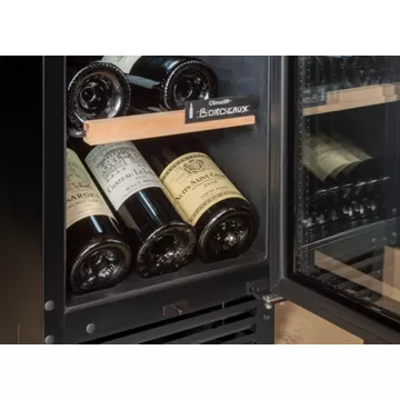 - Type de porte : vitrée, permet de visualiser facilement les bouteilles sans avoir à ouvrir la porte, ce qui réduit la circulation de l’air dans la cave et donc la variation de la température. Le traitement anti-uv protège le contenu.
